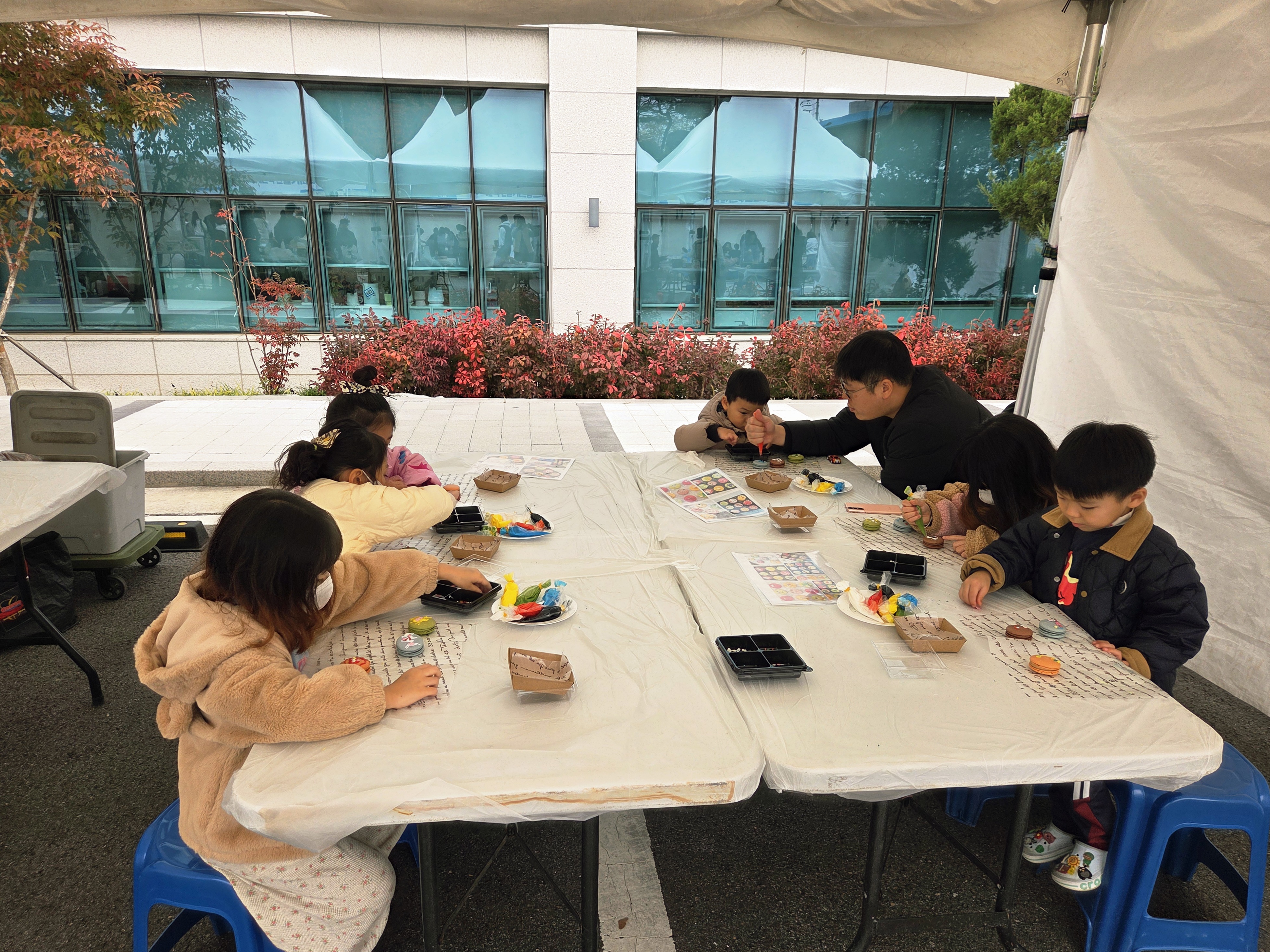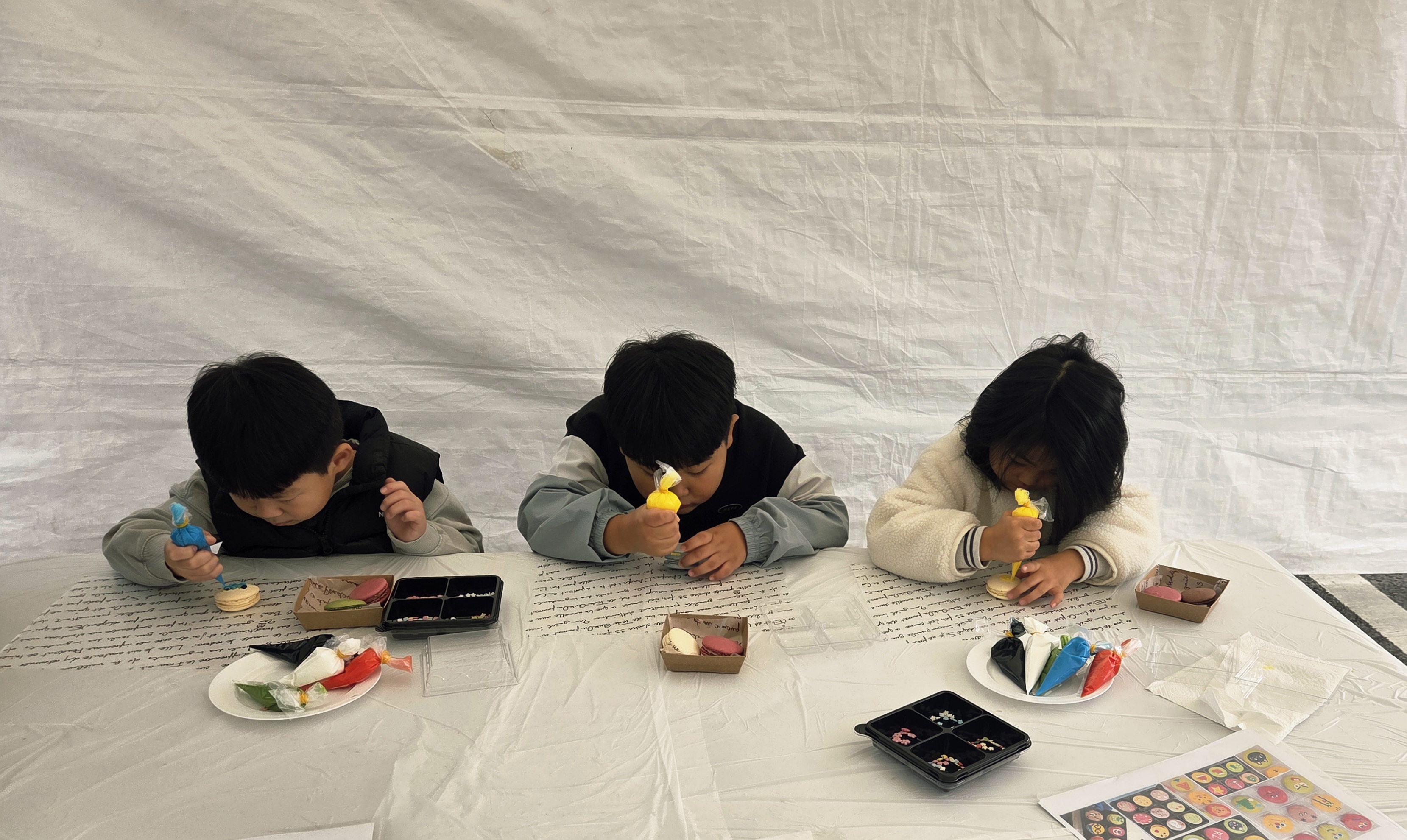 아이들이 직접 예쁜 색의 아이싱을 짜서 마카롱을 꾸미는 체험이었는데, 시작 전부터 부스 앞에는 아이들이 줄을 서며 기대에 찬 얼굴을 보였어요.