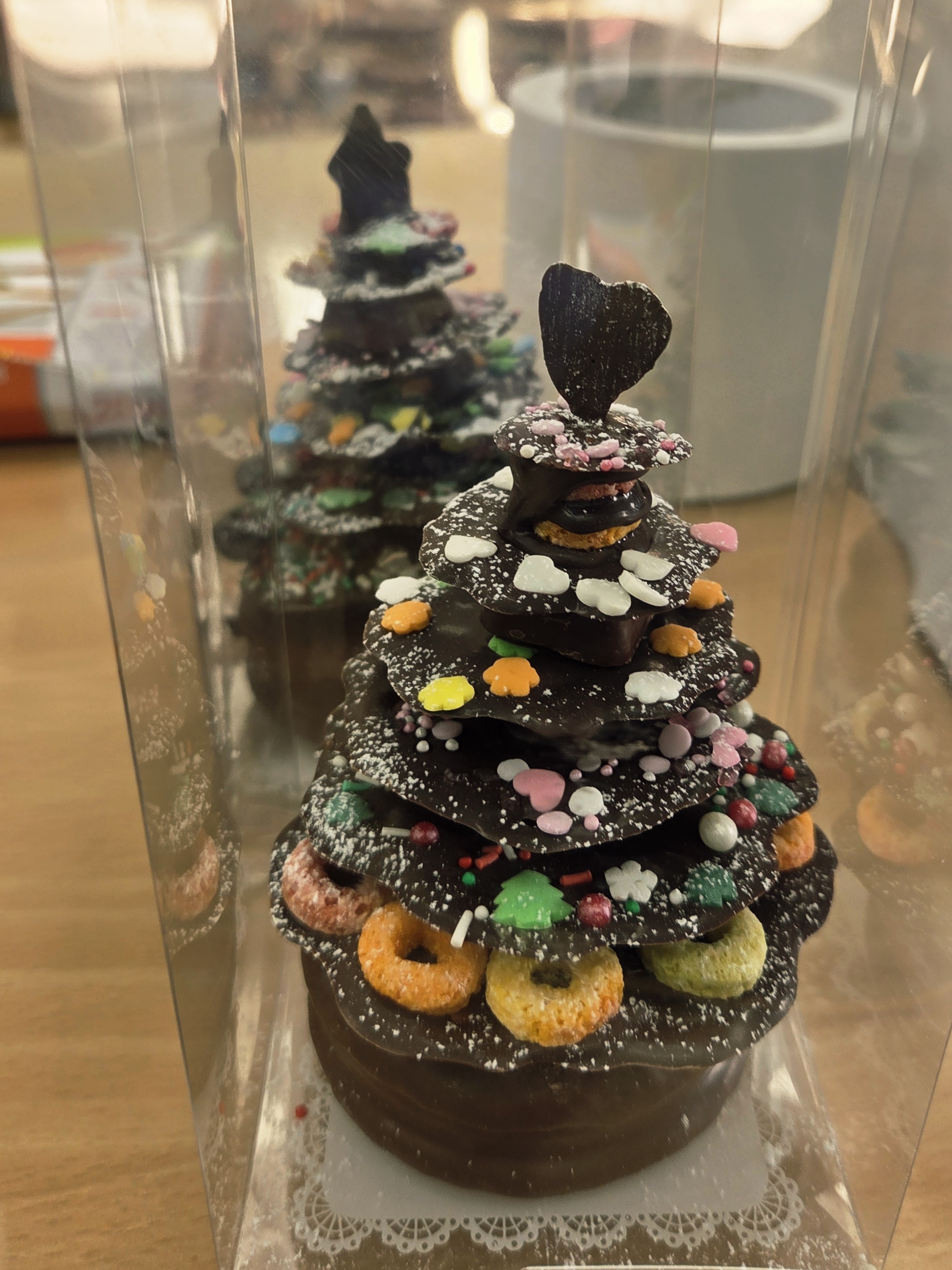 사진처럼 가장 아래에는 두껍고 큰 초콜릿 판을 놓고, 위로 갈수록 점점 작은 판을 올리다 보면 어느새 나무 모양이 또렷해졌어요. 판 사이에는 녹인 초콜릿을 살짝 발라 접착처럼 붙여 주니 흔들림 없이 잘 고정됐답니다.