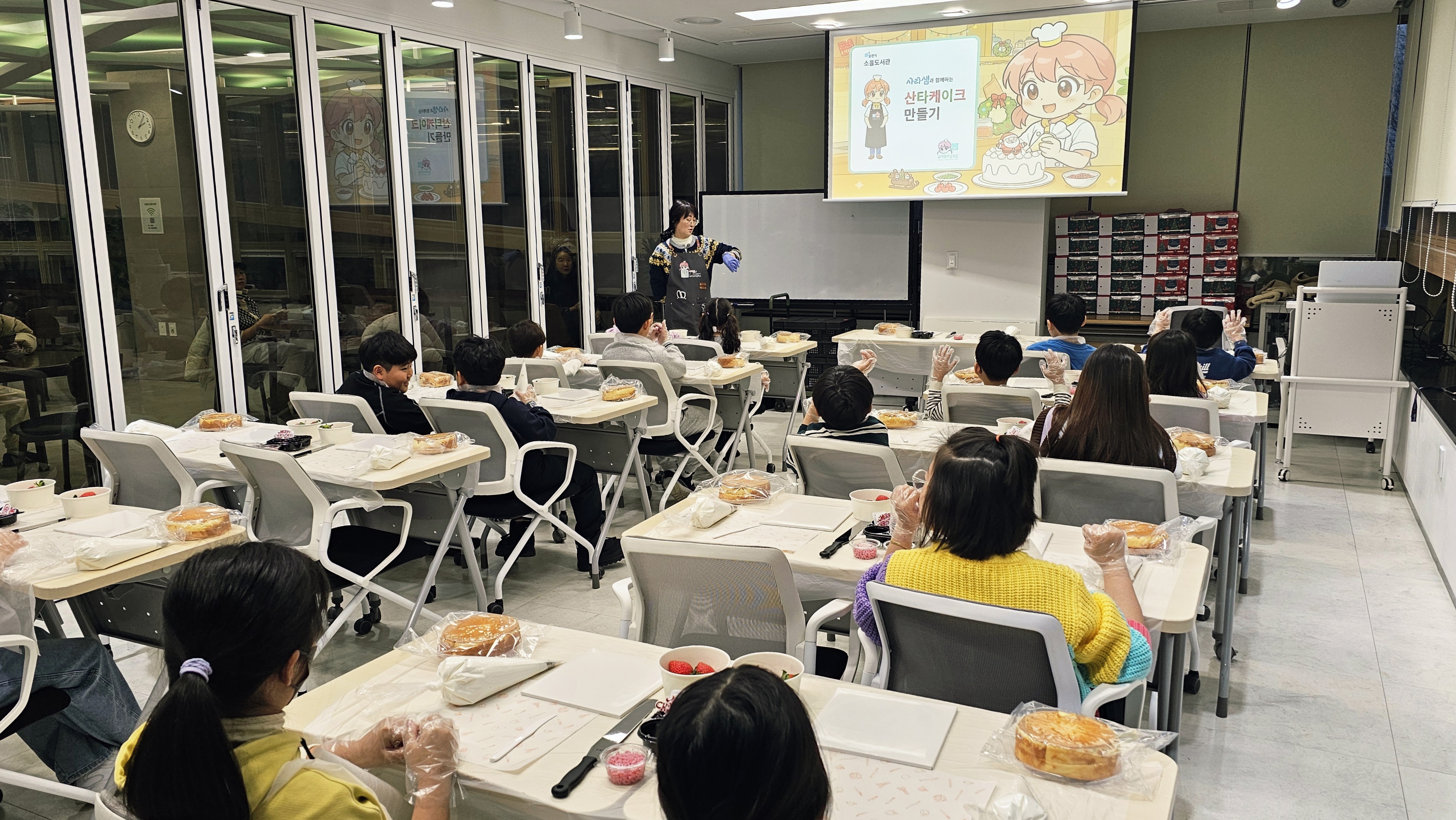 테이블마다 케이크 시트와 생크림, 딸기와 초콜릿 장식이 가지런히 준비되니 교실 분위기부터 벌써 연말 느낌이 가득이었답니다.