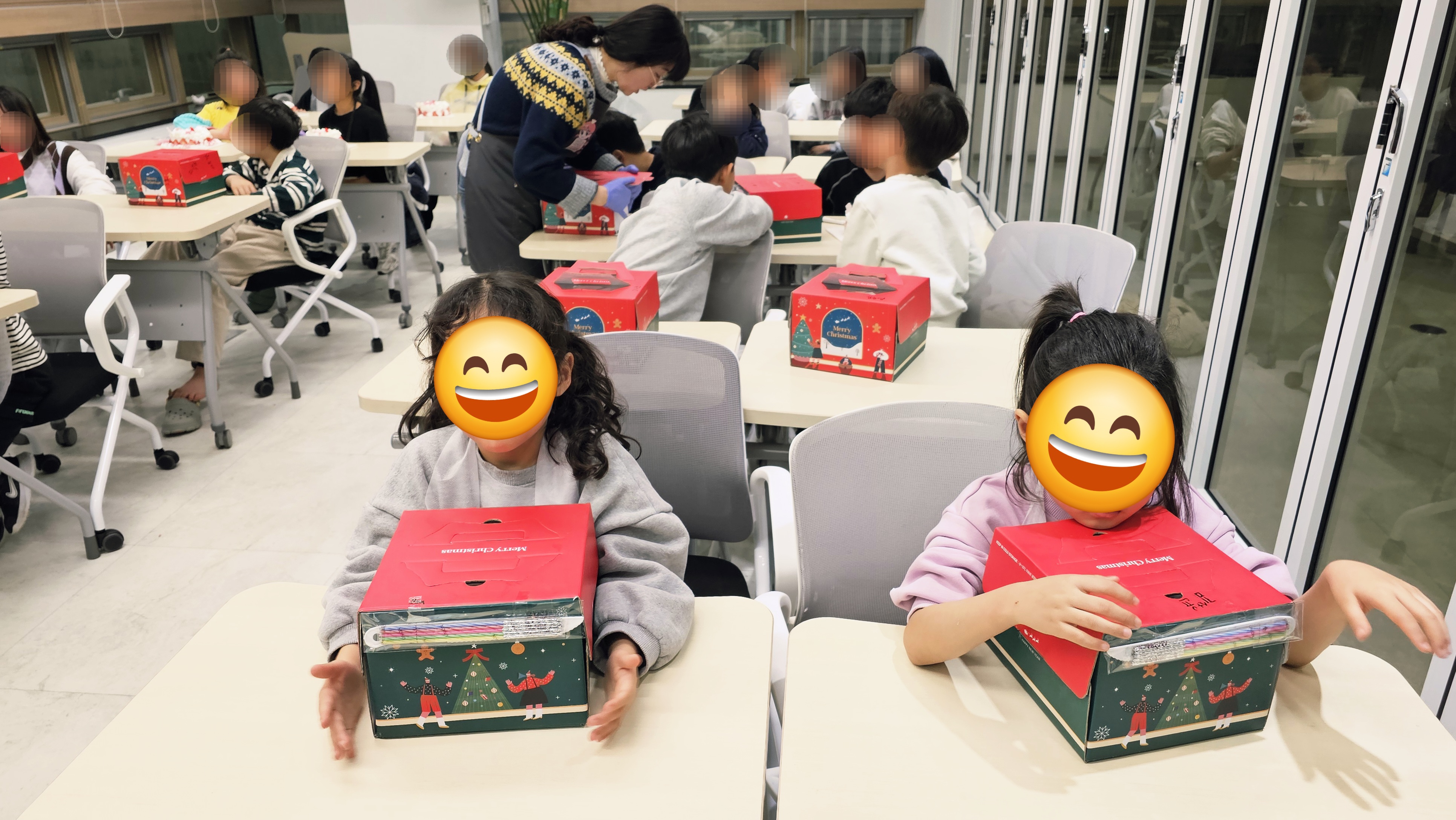 똑같은 재료였지만 모양과 표정은 모두 달라서 더 재미있었고, 아이들 스스로 만든 케이크라는 점에서 성취감도 크게 느껴졌어요. 마지막으로 정리정돈을 마친 뒤 케이크를 조심히 상자에 담아 집으로 가져가며 수업을 마무리했답니다. 달콤한 케이크와 함께 따뜻한 크리스마스 추억이 하나 더 쌓인 시간이었어요.