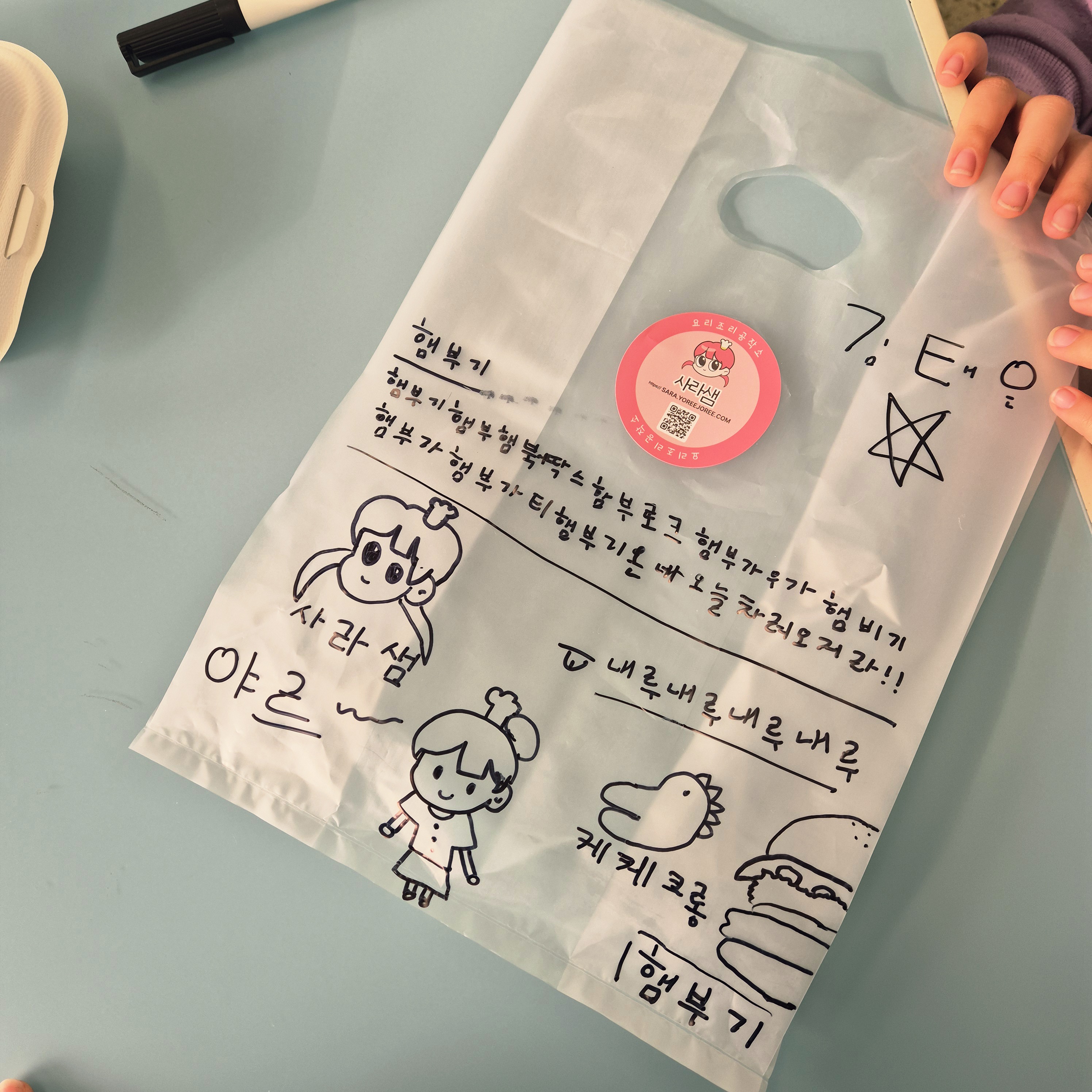 ​창의적인 박스 꾸미기: 이번 수업의 하이라이트! 친환경 펄프 용기에 네임펜으로 나만의 캐릭터와 글씨를 그려 넣어 '세상에 단 하나뿐인 버거 패키지'를 만들었답니다.