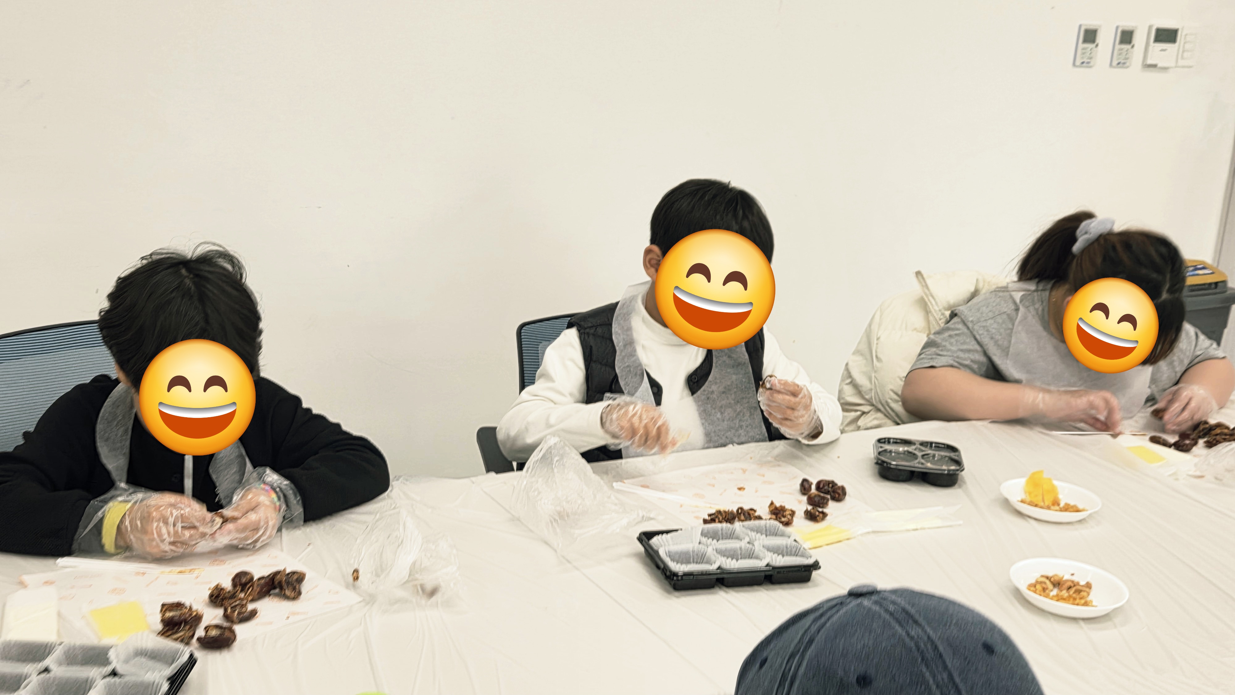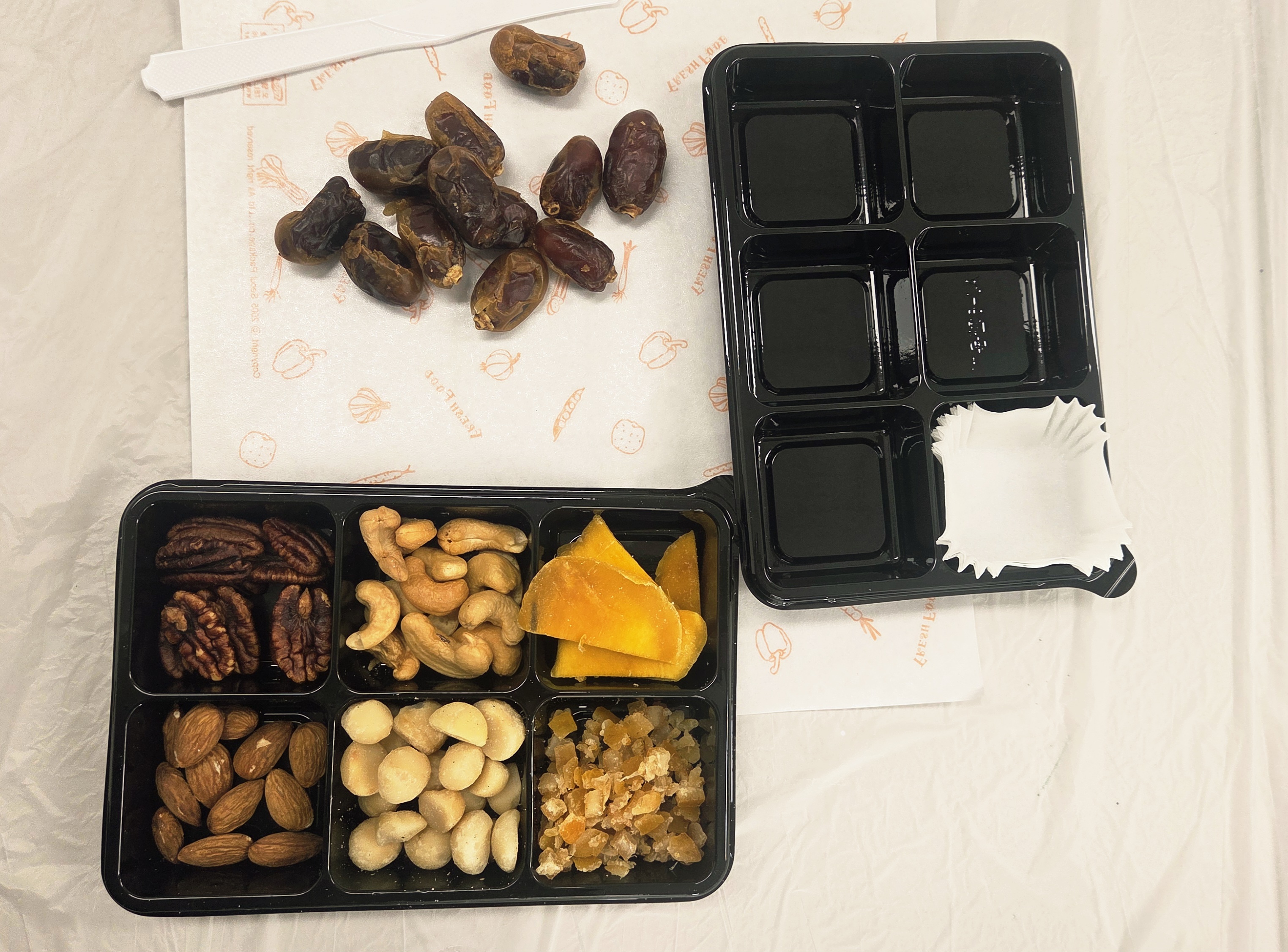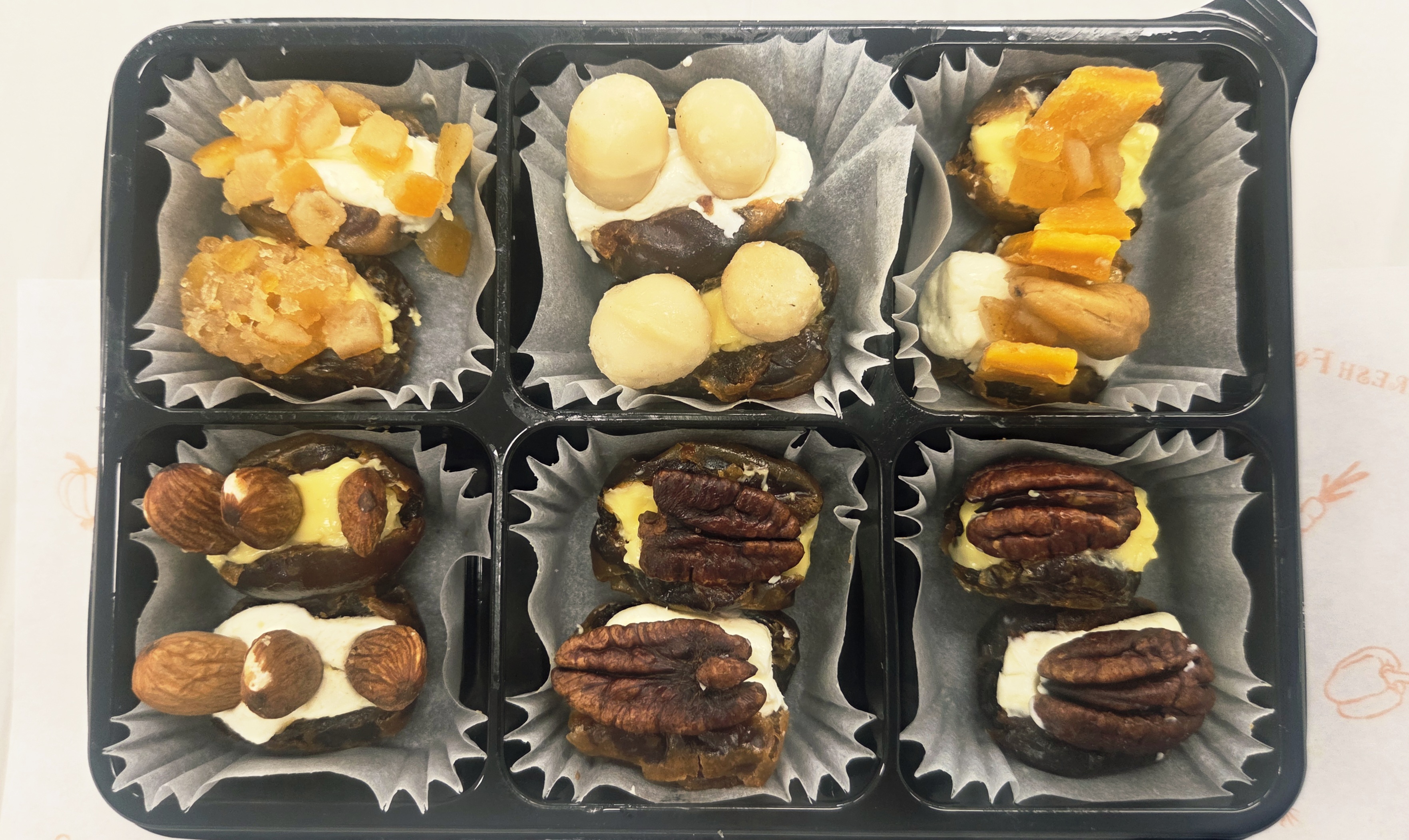 ​먼저 준비된 대추야자의 씨를 깔끔하게 제거해 줍니다. 그다음 대추야자 속에 고소한 호두나 아몬드, 피칸 같은 견과류를 취향껏 듬뿍 채워 넣었어요.