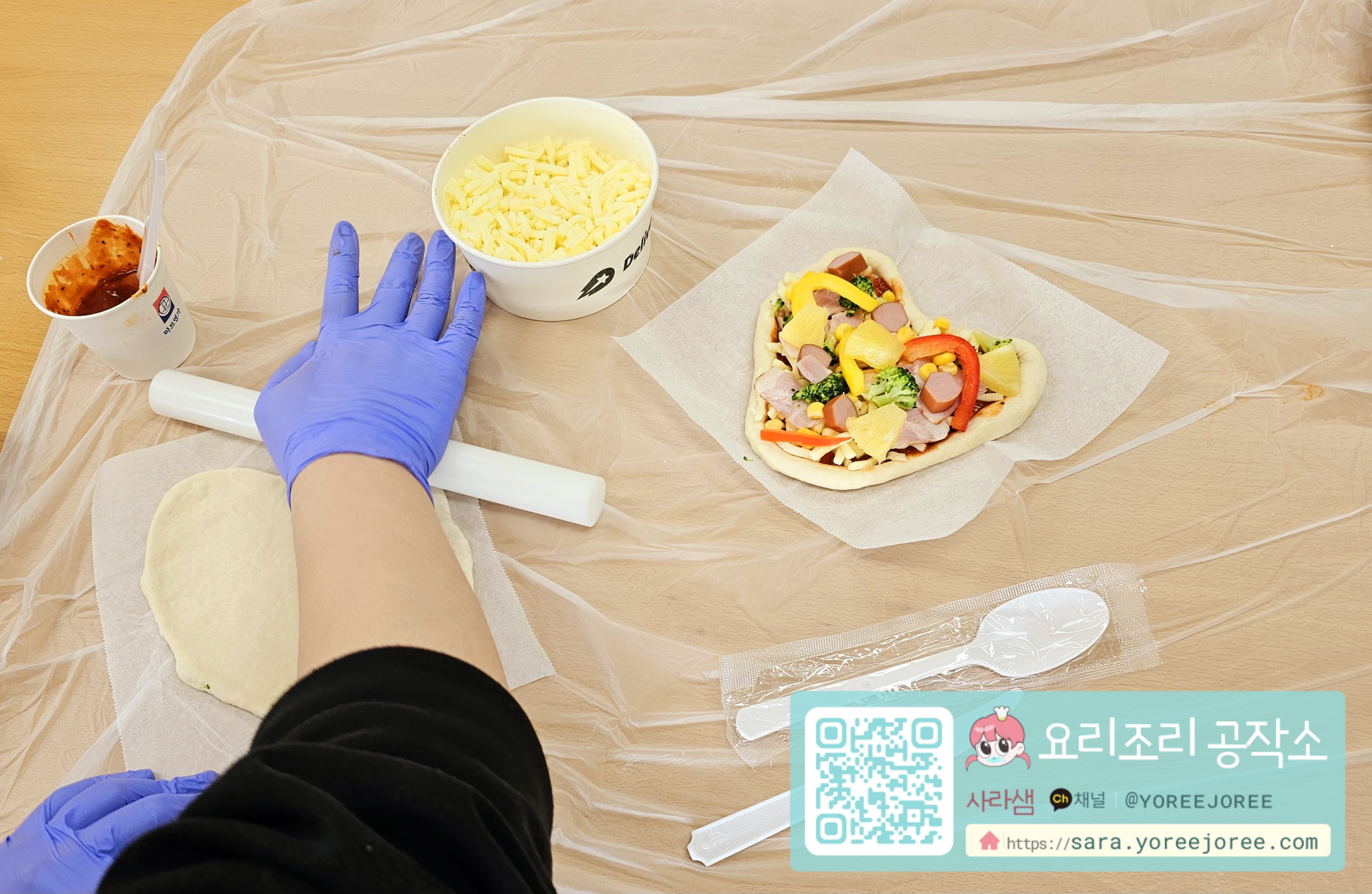 먼저, 각자 원하는 동물 모양을 상상하며 피자 반죽을 준비했고, 그 위에 치즈와 다양한 재료를 이용해 동물의 얼굴을 표현했습니다.