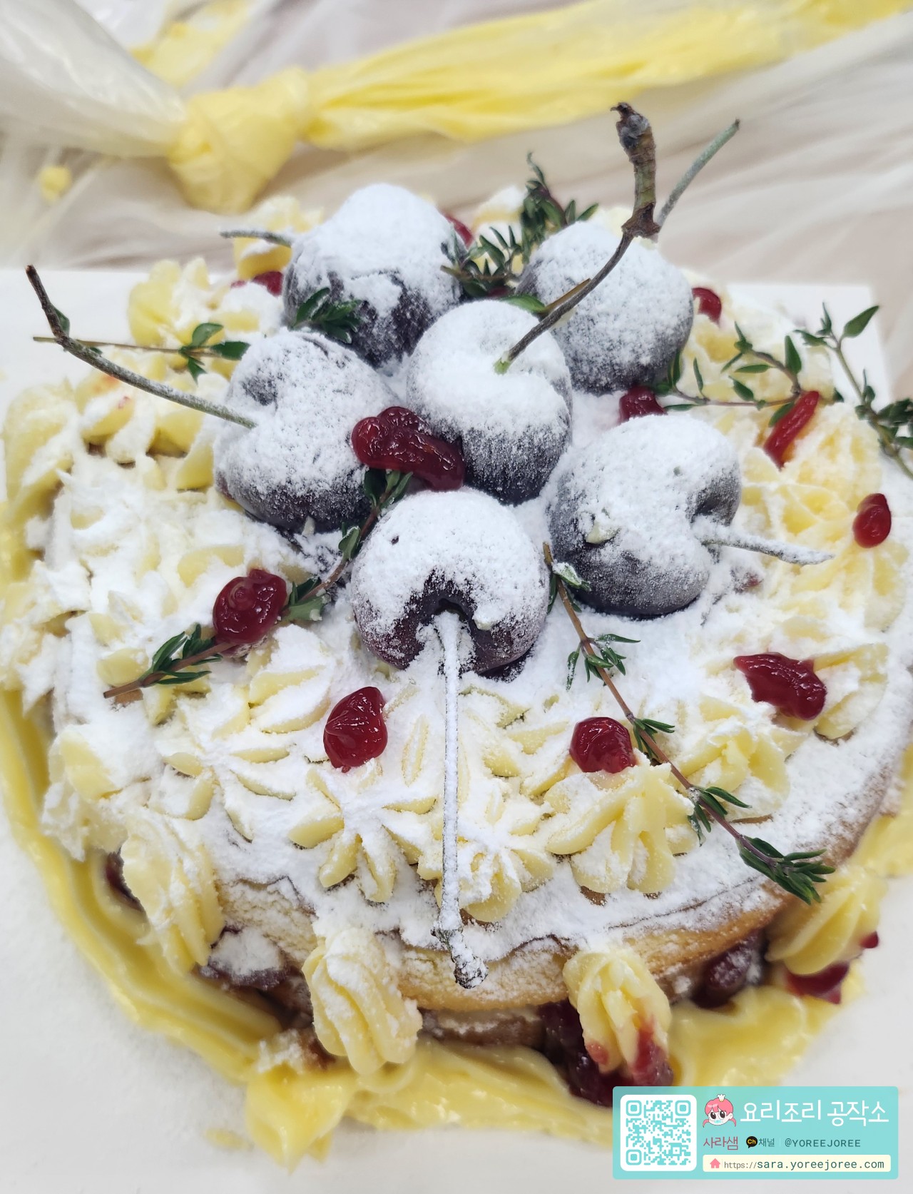 마지막으로 데코 타임! ✨ 샤인머스캣, 체리, 딸기 같은 제철 과일로 장식하고, 데코 스노우(슈가 파우더)를 솔솔 뿌려 마무리했어요. 케이크 박스에 칼까지 넣어 포장하면 완성! 🎁