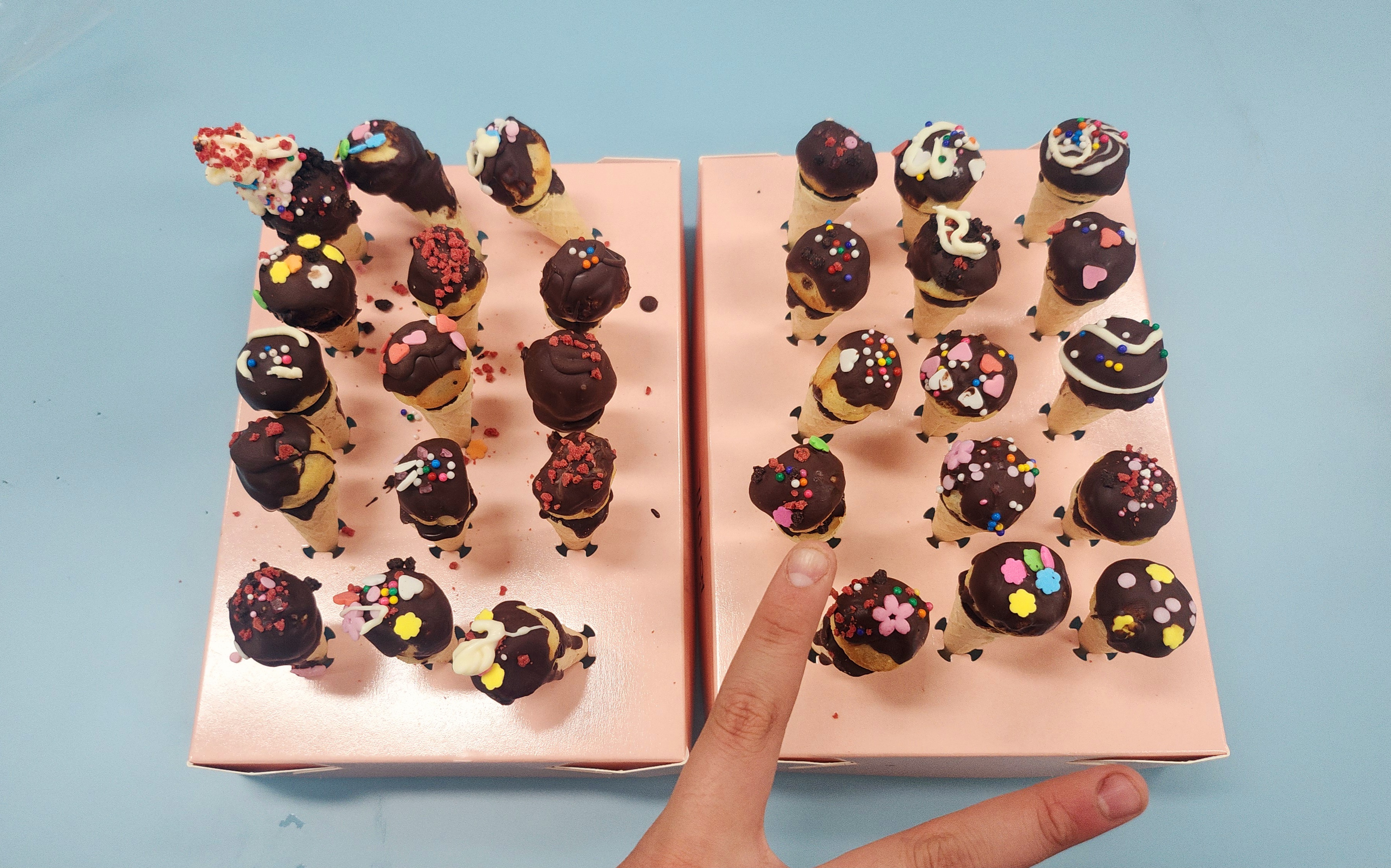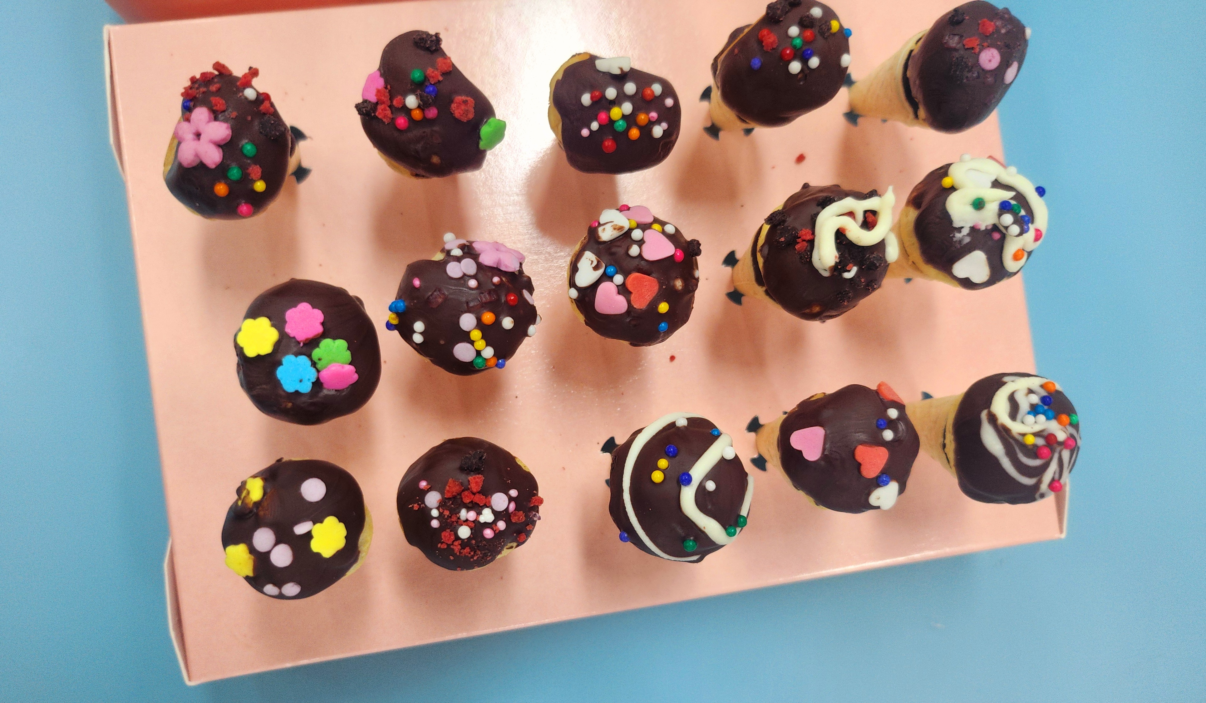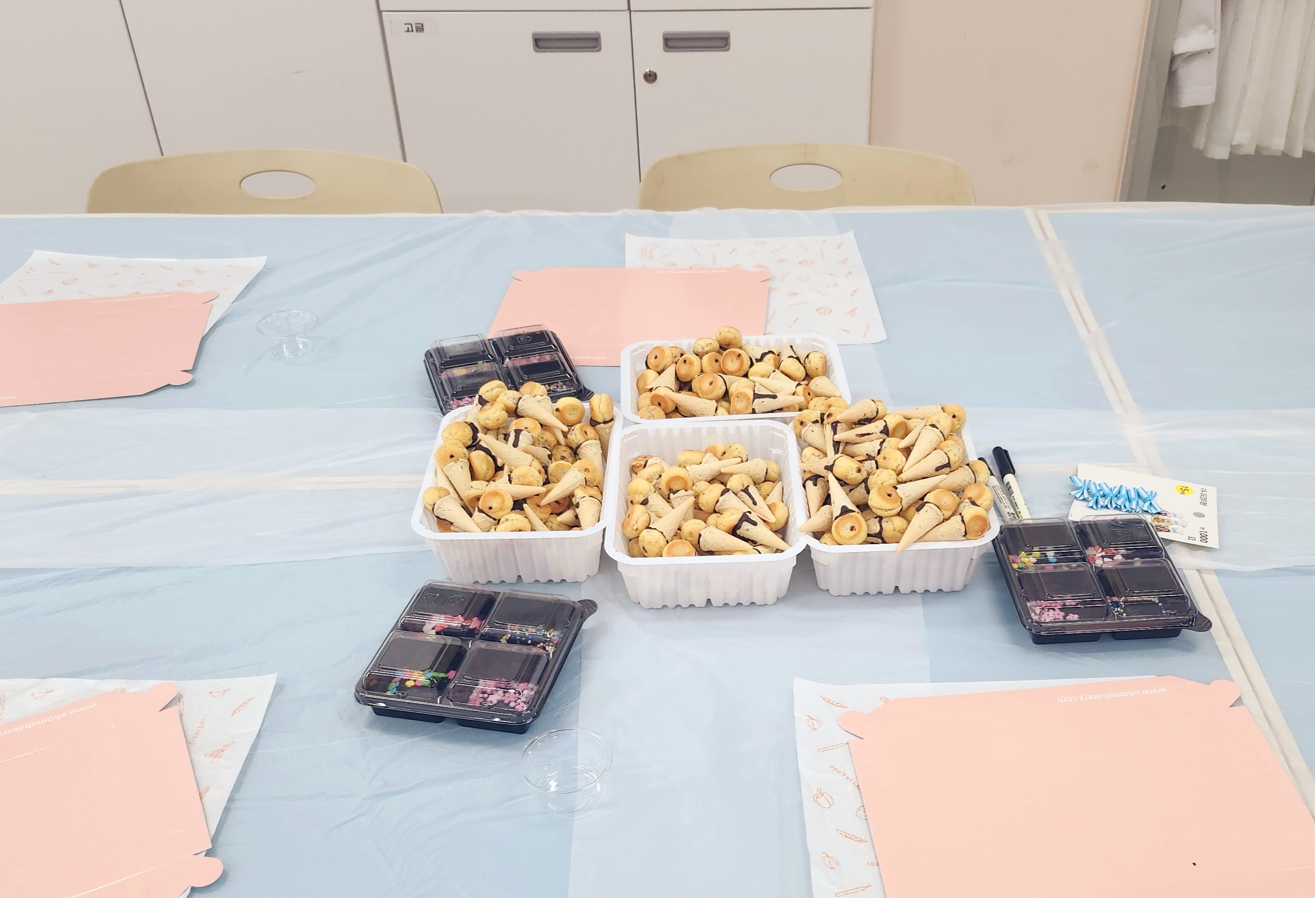 초콜릿을 중탕해서 부드럽게 녹인 후, 각자 미니콘 위에 초콜릿을 묻히고 알록달록한 스프링클과 토핑으로 자유롭게 꾸며보는 활동이에요.