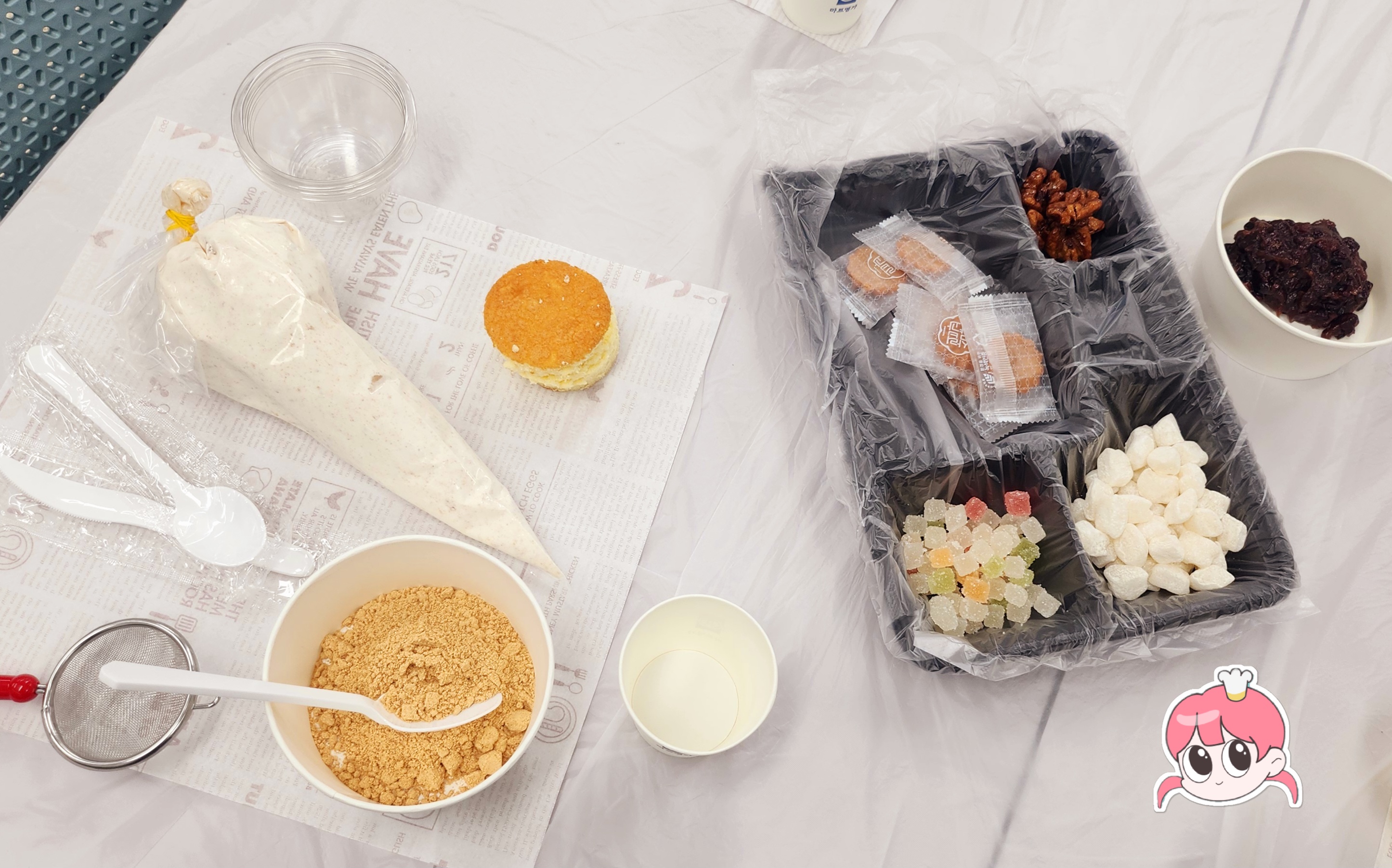 이번 클래스에서는 생크림, 촉촉한 케이크 시트, 달콤한 팥, 미니 약과, 젤리, 견과류 등 다채로운 재료를 활용해 나만의 디저트를 직접 디자인해볼 수 있었어요. 각자 개성 가득한 꾸미기 결과물이 나와서 사진 찍는 재미도 쏠쏠했죠!