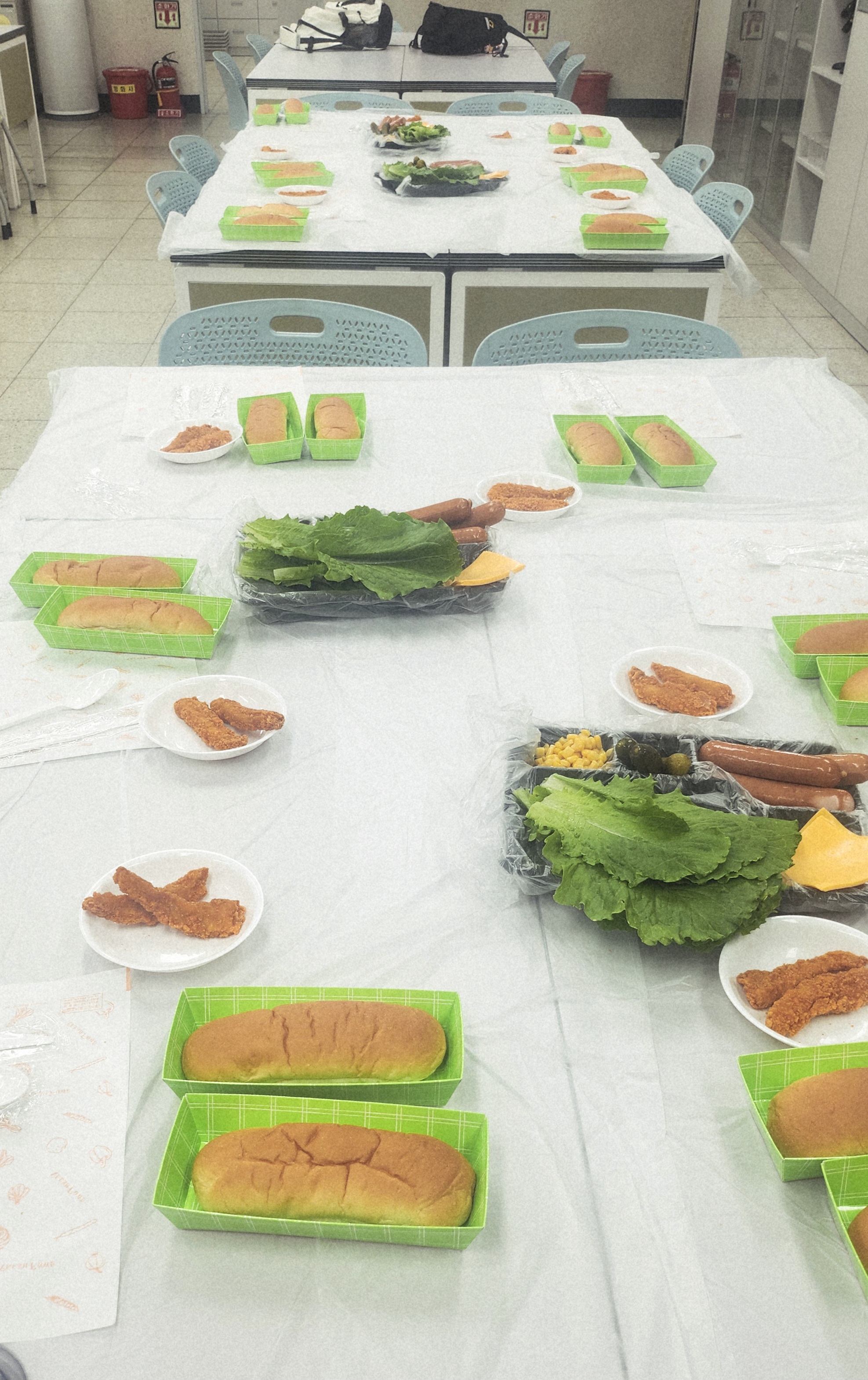 먼저 빵을 반으로 갈라 전자렌지에 살짝 데우고, 소시지와 치킨텐더를 전기팬에 노릇하게 구웠어요. 그 사이 아이들은 양배추와 피클, 스위트콘 등을 정리하며 재료를 직접 만지는 재미를 느꼈답니다.