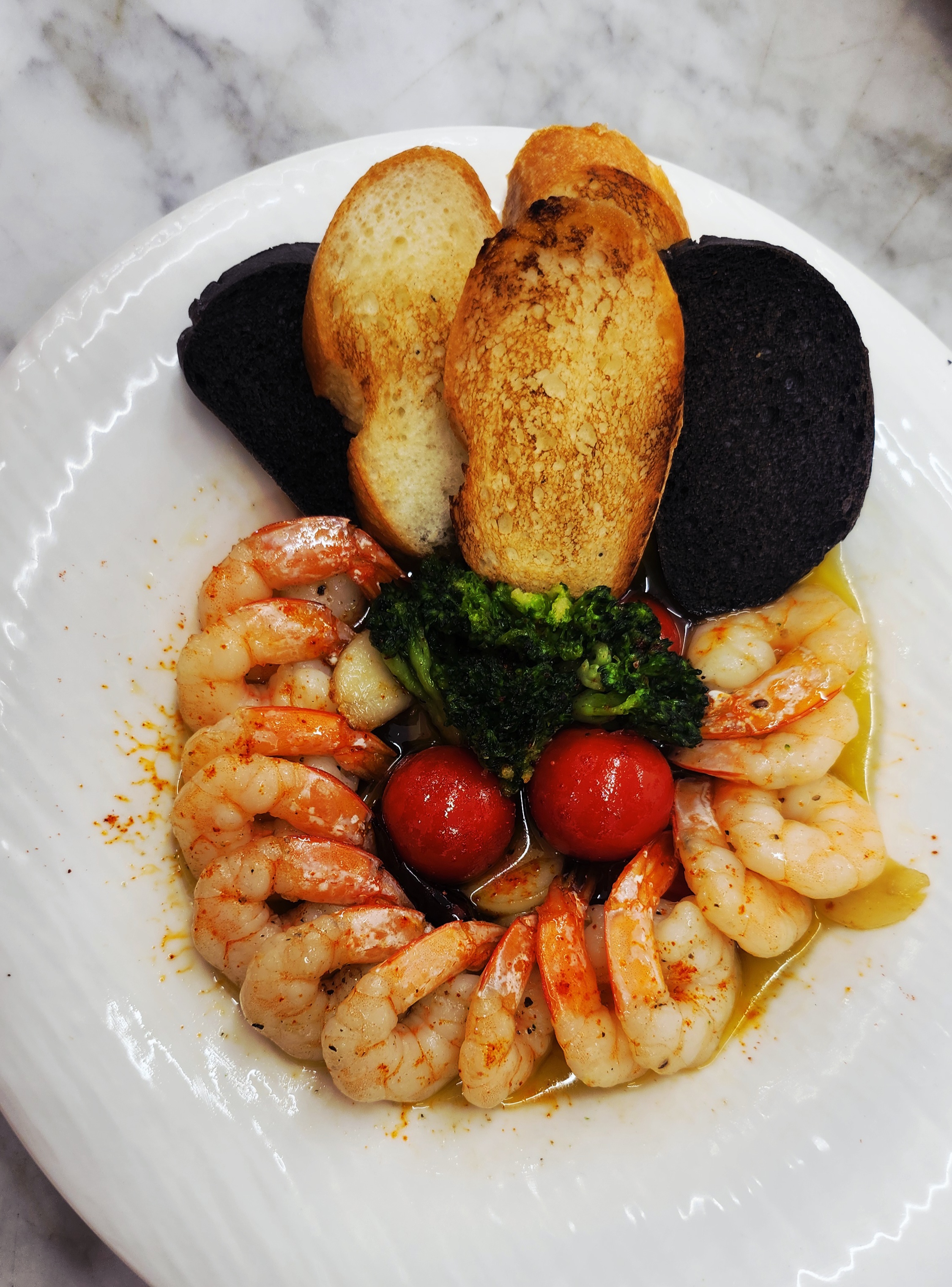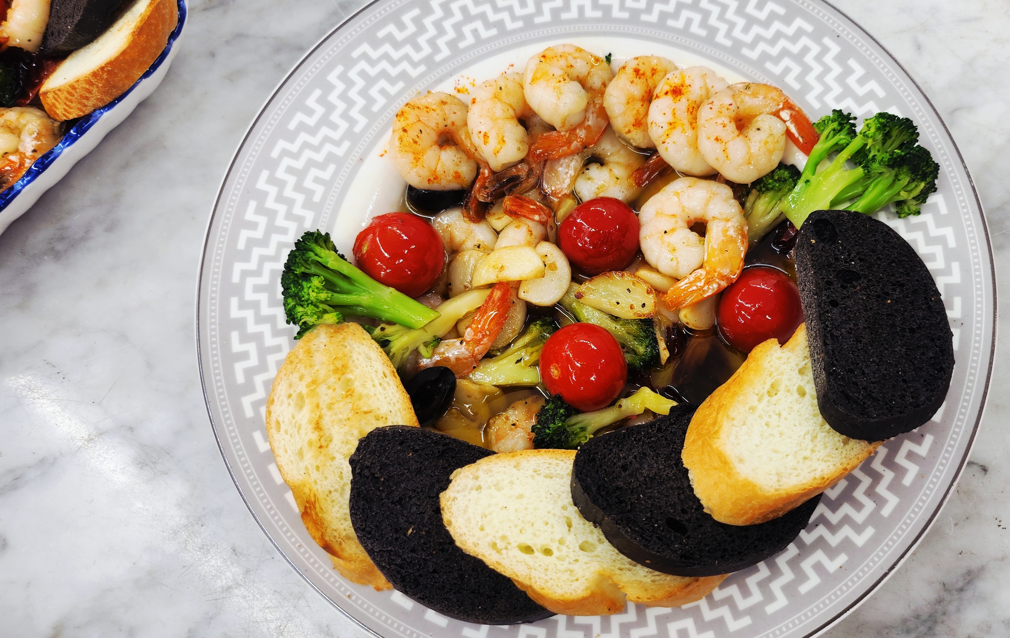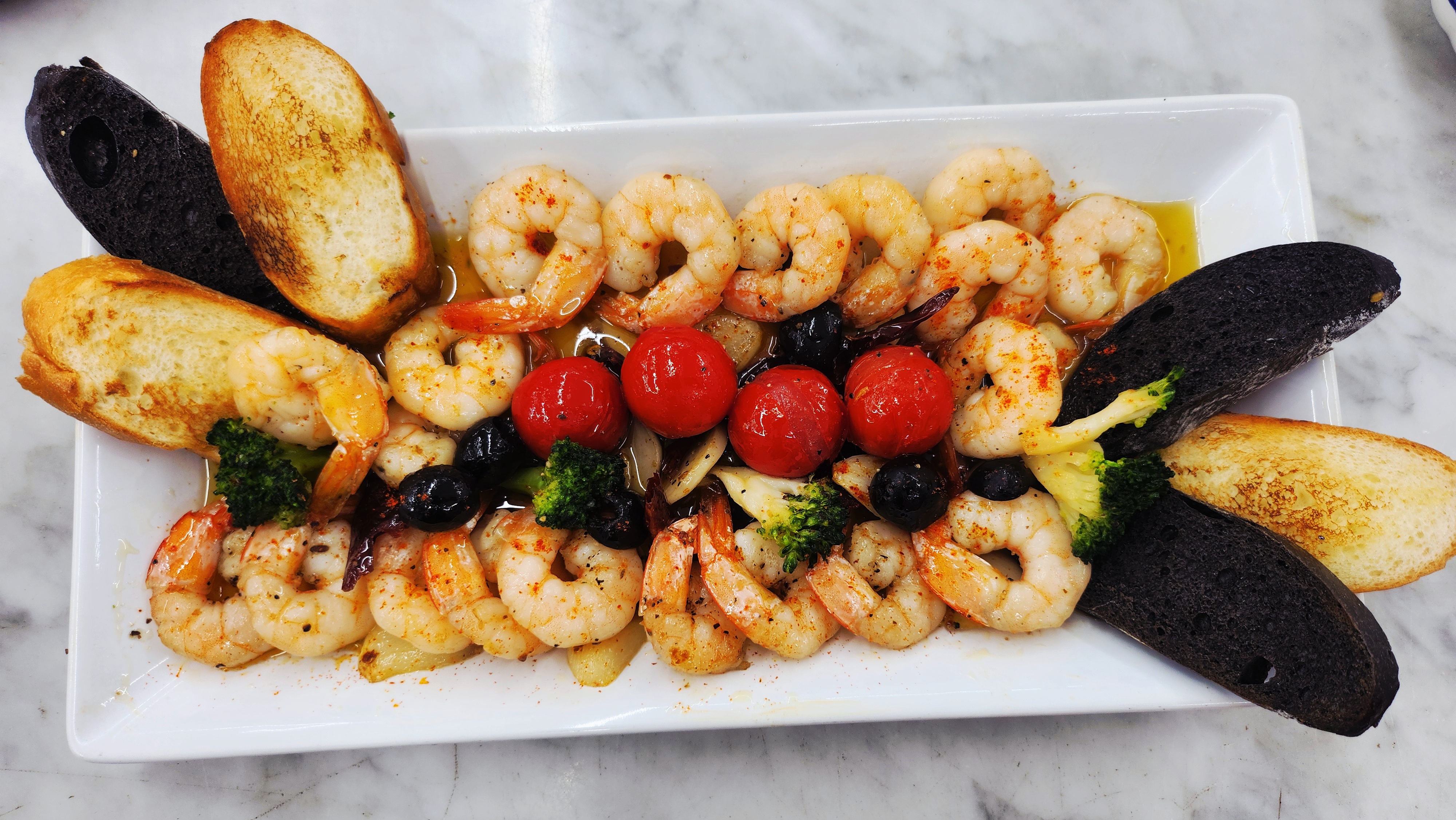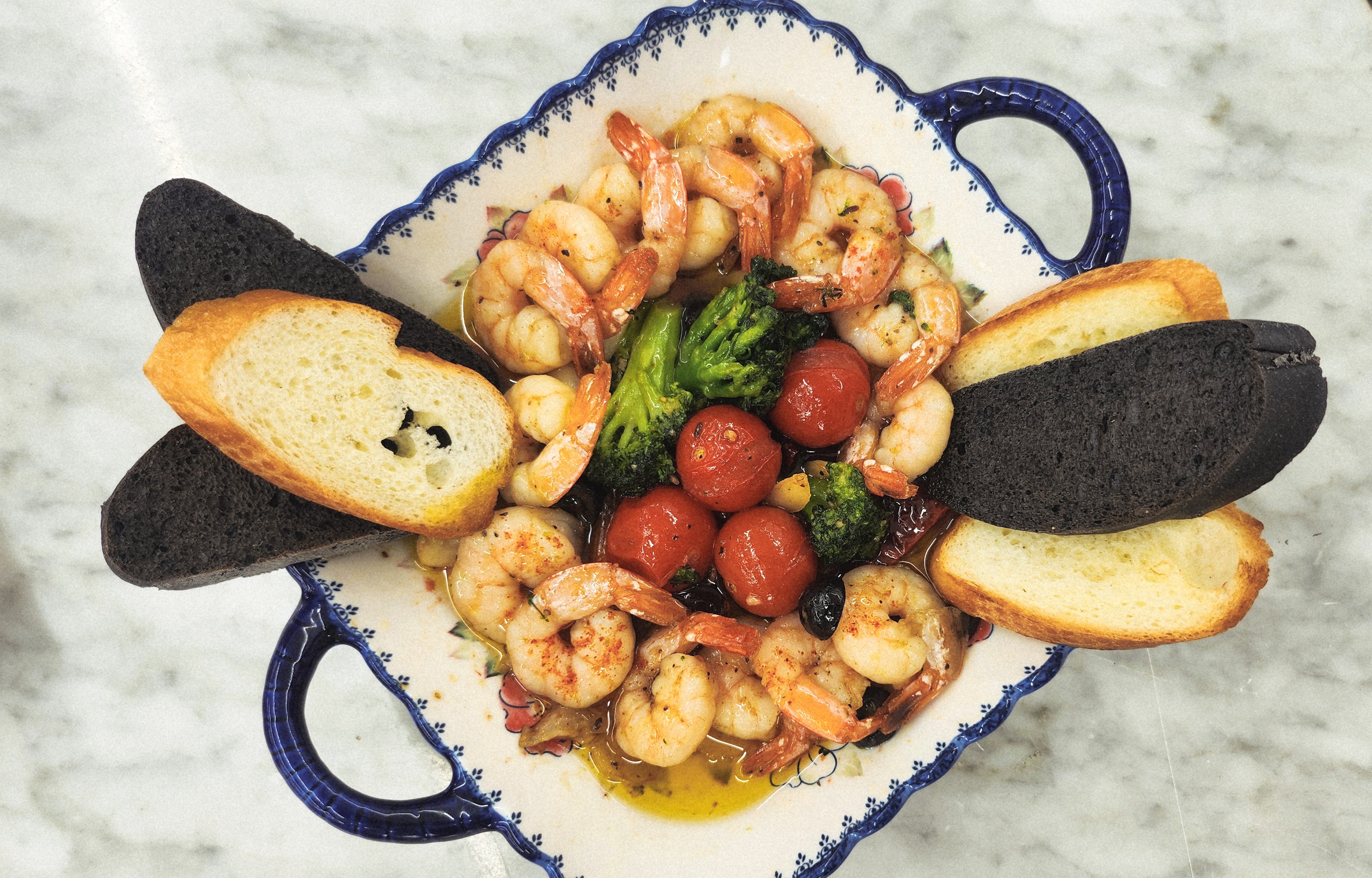 요리 순서는 간단해요. 올리브오일에 얇게 썬 마늘과 건고추를 넣고 바글바글 끓인 뒤, 손질한 새우를 앞뒤로 재빠르게 볶아주세요. 방울토마토, 통올리브, 브로콜리를 넣고 한 번 더 살짝 끓이면 완성!