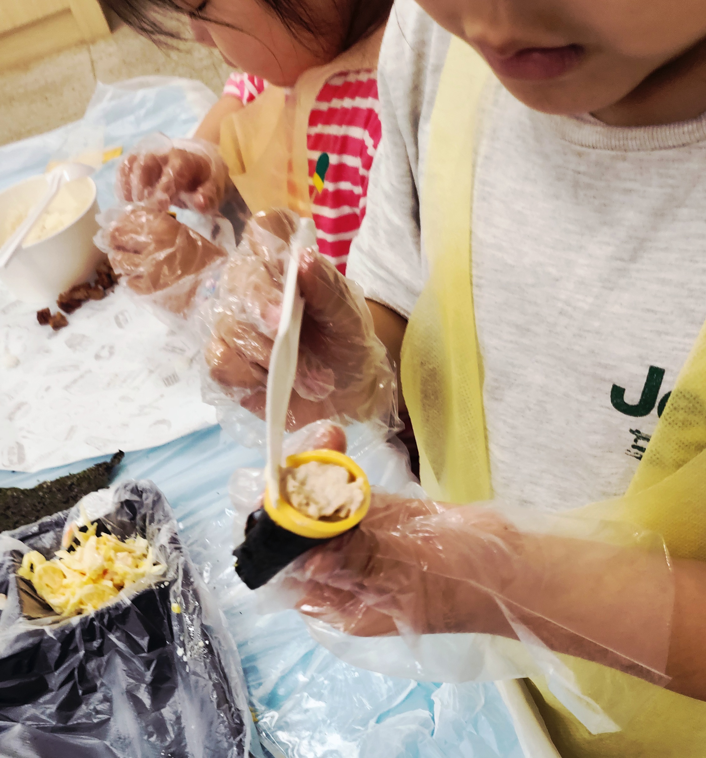 오늘 수업은 포천 일동초 방과후 교실에서 진행됐는데, 처음 칼을 잡아 본 저학년 친구들도 뚝딱뚝딱 예쁜 김밥을 만들어 스스로 뿌듯해했답니다. 조리 순서는 간단해요: 양념 밥 만들기 → 햄·치즈 붙인 김 삼각 접기 → 토핑 올려 9칸 도시락에 담기!