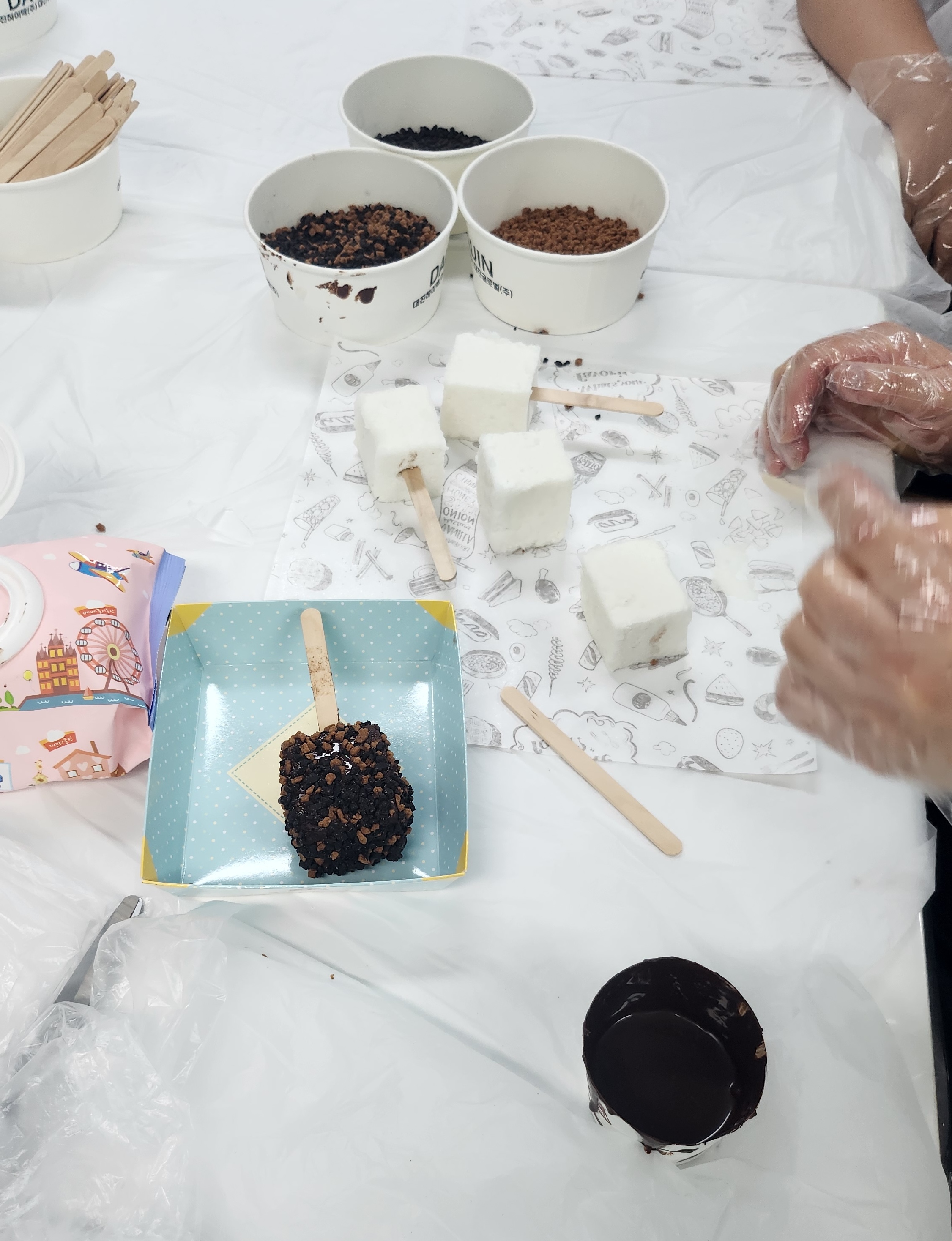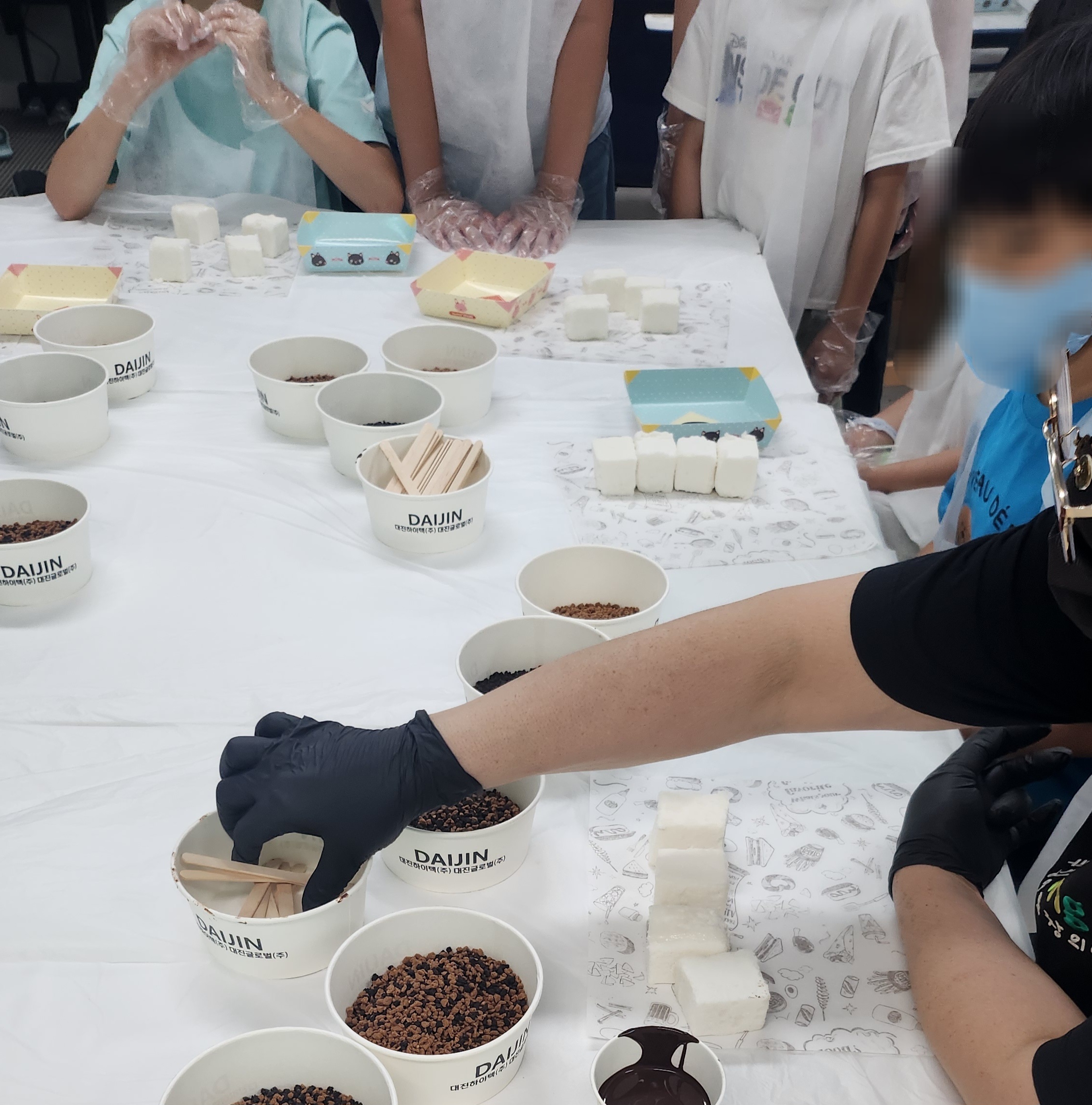 만드는 방법도 정말 간단해요! 막대를 꽂은 백설기에 녹인 초콜릿을 입혀주고, 크런키를 콕콕 눌러 묻혀주면 끝이에요. 오늘은 의정부돌봄교실과 요리조리공작소가 함께한 수업에서 아이들과 돼지떡바를 만들었는데, 만드는 동안 웃음과 감탄이 끊이지 않았답니다.