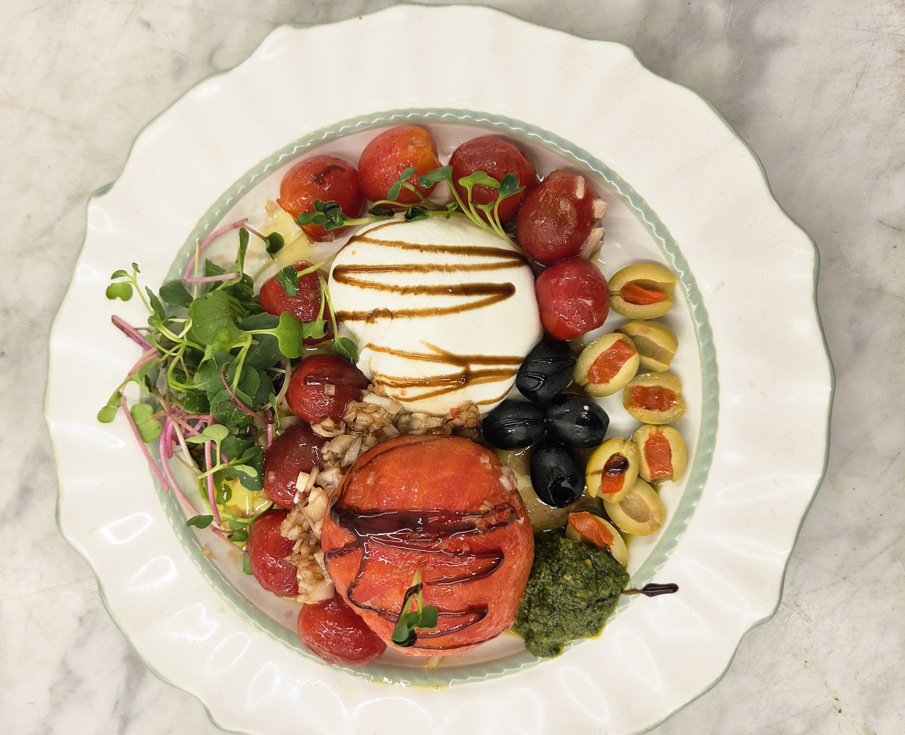 이 샐러드는 이탈리아 남부에서 유래한 '부라타'라는 프레시 치즈가 포인트인데요, 모차렐라보다 훨씬 크리미한 속살을 품고 있어 한 입 베어 물면 입안 가득 고소함이 퍼지는 매력이 있어요.