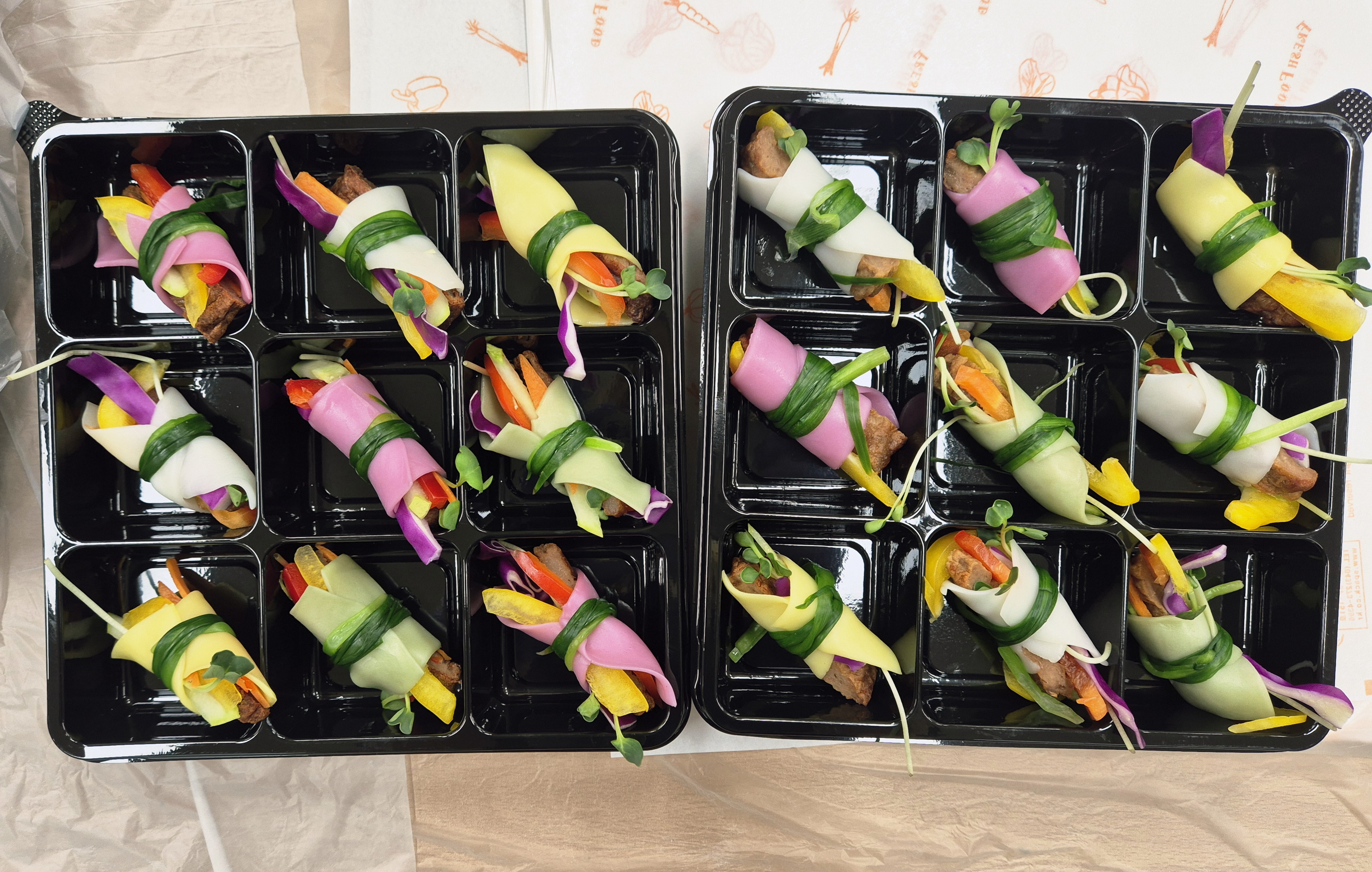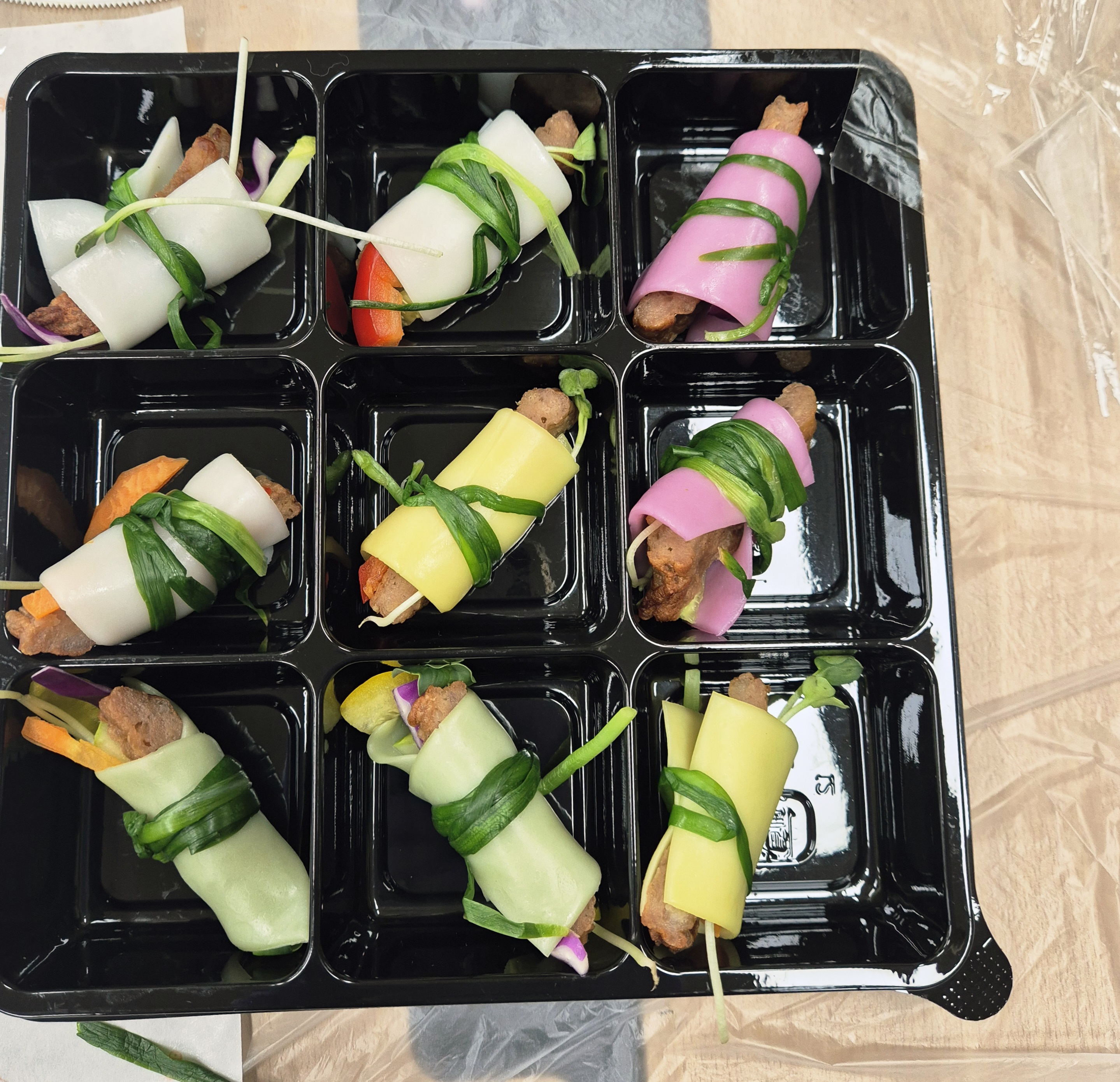 트레이 위에 가지런히 담긴 떡쌈말이는 마치 미니 꽃다발처럼 곱고 예뻤답니다