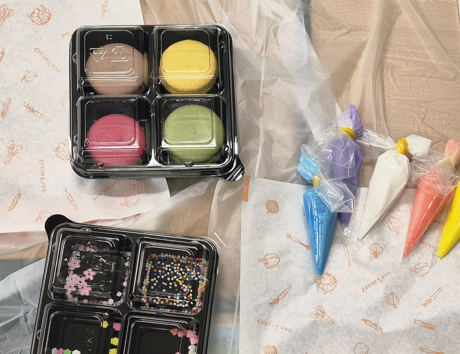 이번 수업에서는 미리 준비된 바닐라, 초코, 딸기 등 여러 맛의 마카롱 위에 컬러풀한 아이싱과 초콜릿펜을 사용해 꾸미기를 진행했어요.