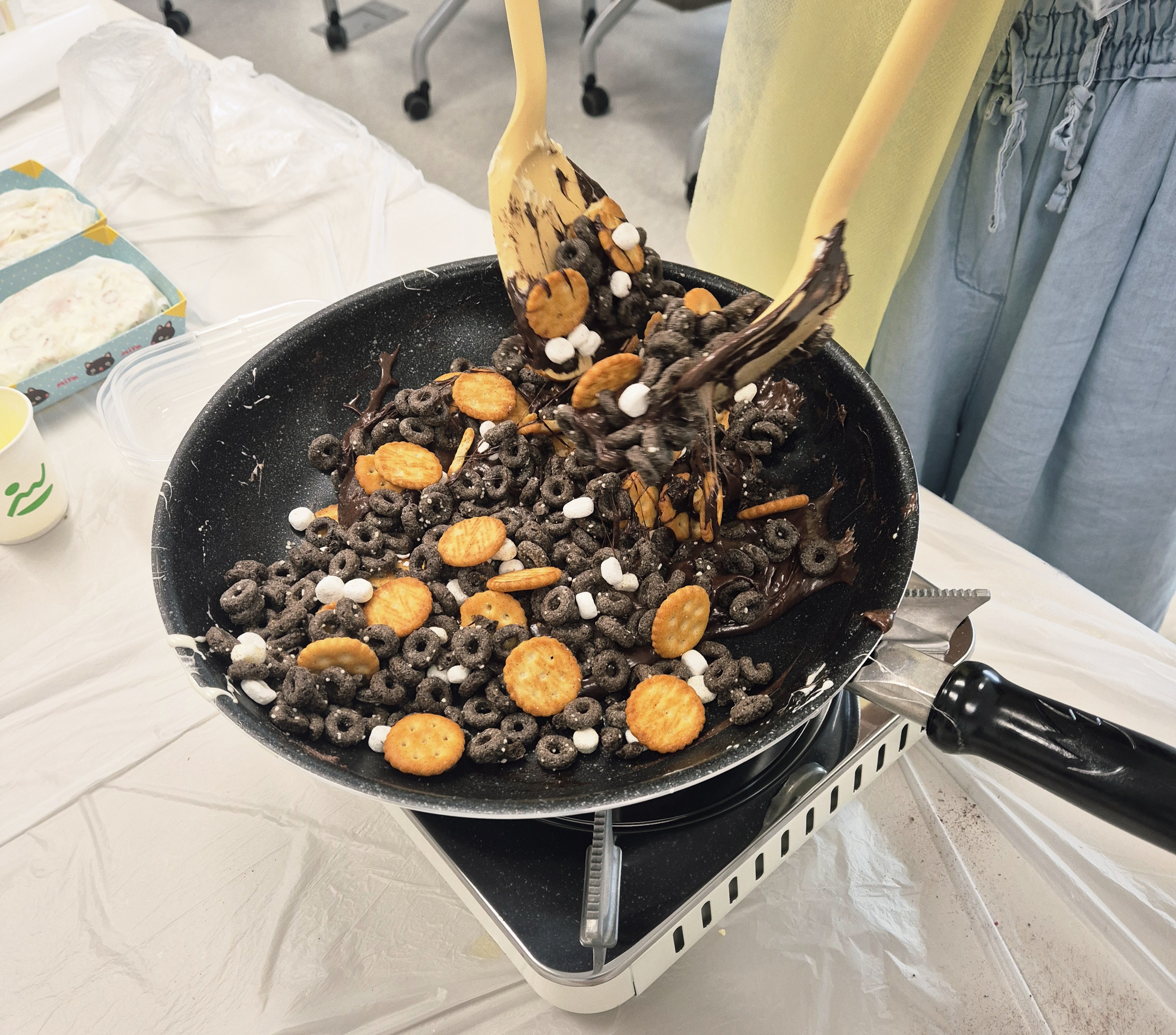 수업은 손 씻기와 위생교육으로 시작했어요. 이후 버터와 마시멜로를 녹이는 과정에서 아이들은 “마시멜로가 사라져요!”라며 신기해했고, 시리얼과 견과류를 넣어 빠르게 섞는 순간에는 다들 힘을 합쳐 저어주었지요. 평평하게 다져 굳힌 후 예쁘게 포장까지 완성하니, 작은 제과점 사장님이 된 듯한 뿌듯한 표정이 교실 가득했어요.