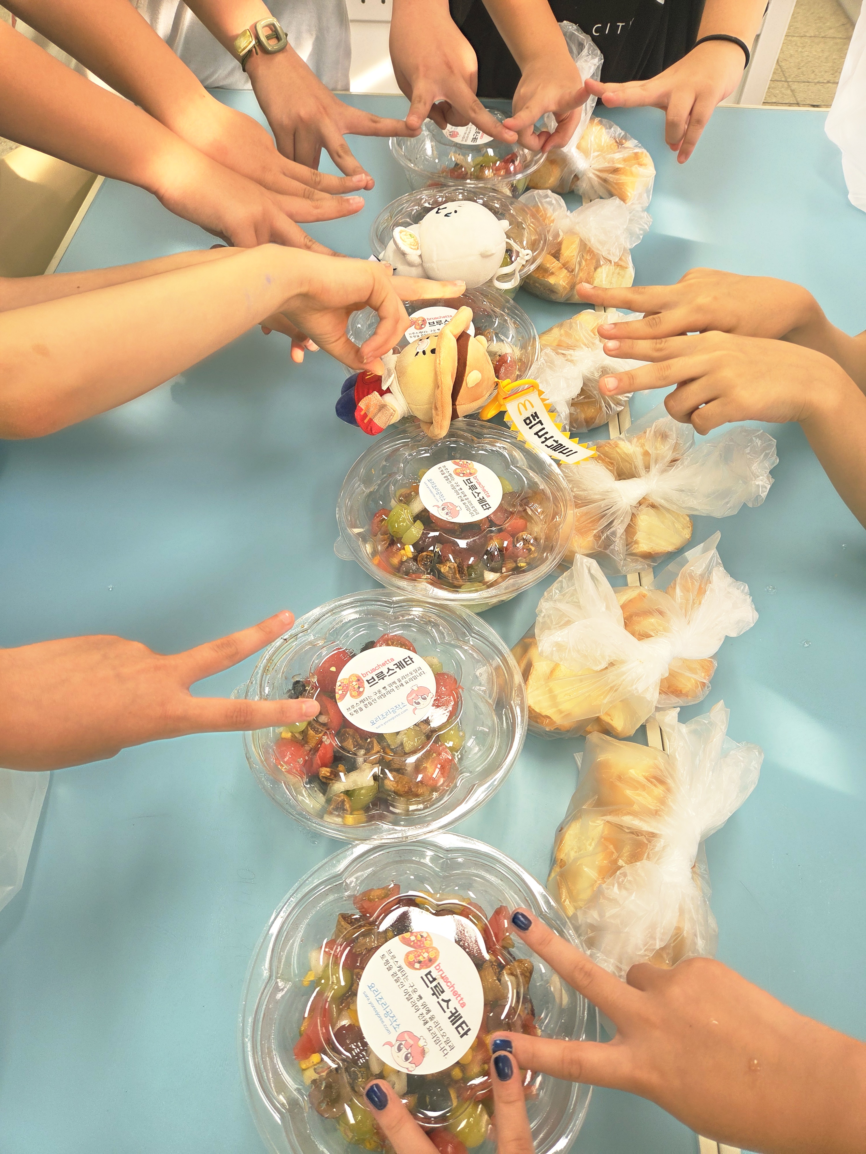 마지막으로 바삭하게 구워진 바게트빵을 곁들이자 완벽한 브루스케타가 완성되었습니다. 아이들은 직접 만든 토핑을 빵 위에 올려 맛을 보며 신선한 채소의 풍미와 고소한 올리브오일 향을 느꼈습니다. 간단하지만 완성도 높은 요리라 아이들도 성취감을 크게 느꼈고, 무엇보다 색감이 예뻐서 눈으로도 즐길 수 있는 요리 시간이었답니다.
